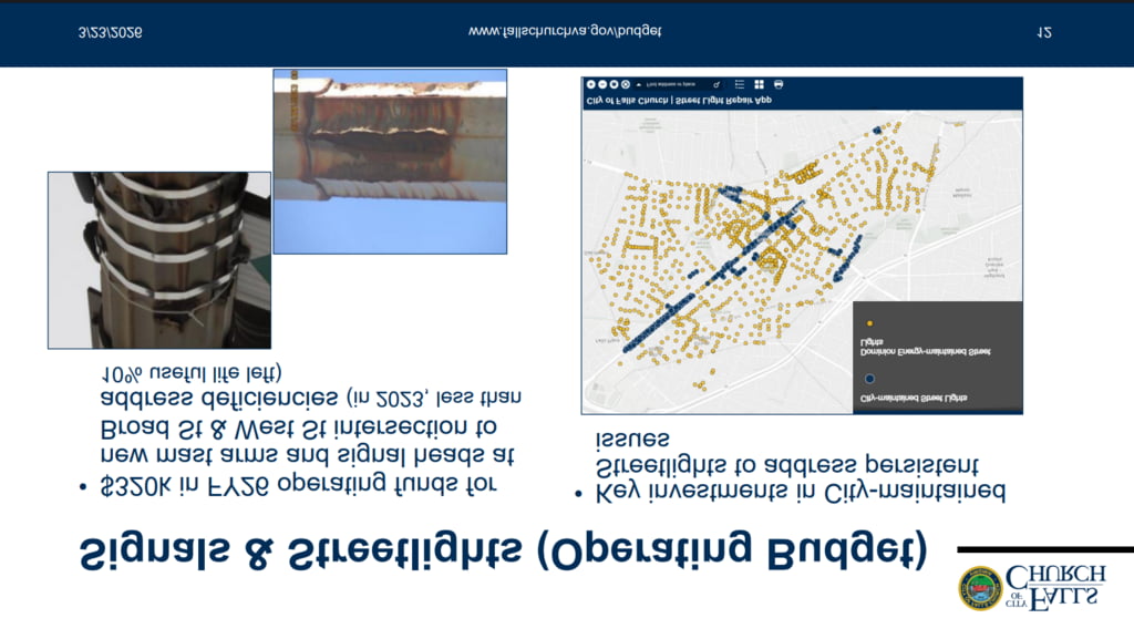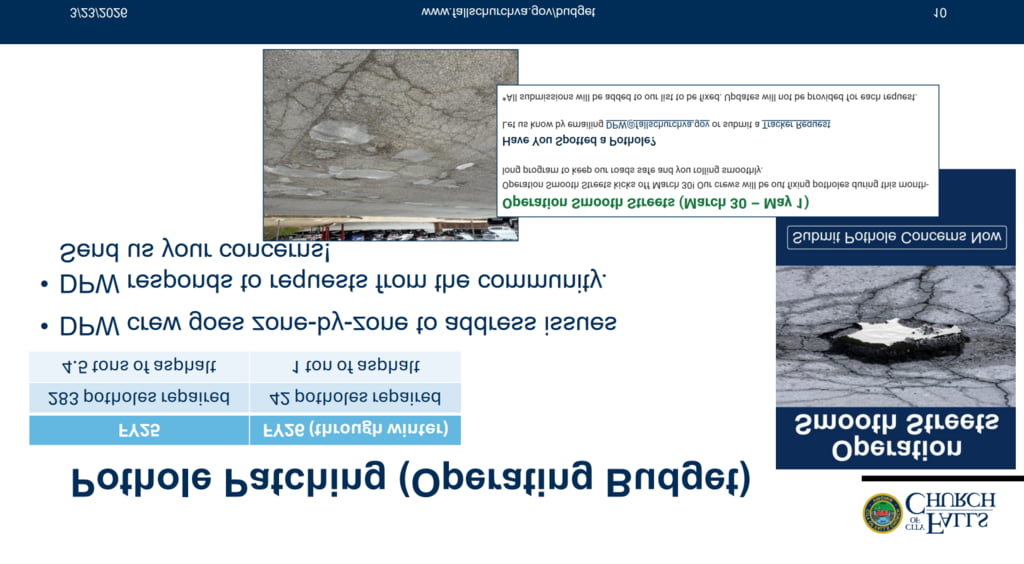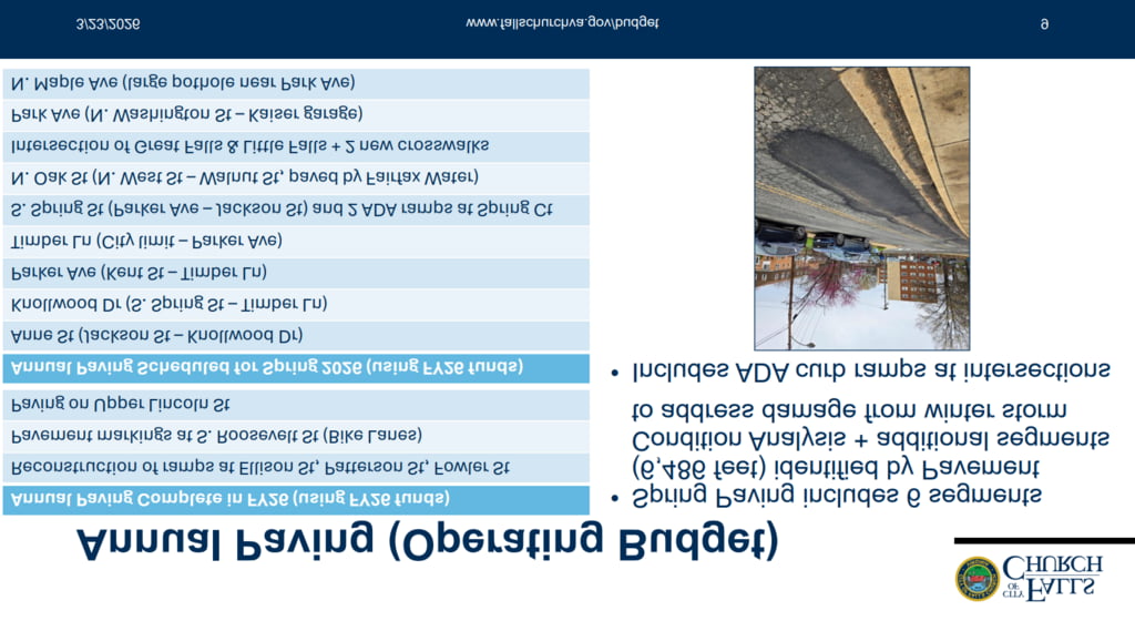 - Quick history on public works budget: during the Great Recession era 15+ years ago and then our big capital push to afford the debt for a new high school, city hall, and library in the early 2020s – maintenance budgets got less money. The past several years when revenues have been good with Covid dollars and high interest income, we injected that one time money into the paving budget and stabilized paving conditions. We are also developing more routine paving schedule based on paving scores we get every 3 years (the last was 2022 and 2025). We also received state grant money to modernize our signals with better “smart” technology and improving timing (8 out 18 done).
