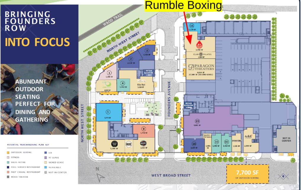 - In our last Economic Development Committee meeting at the end of July, we heard the latest on leasing/openings at Founders Row. A steakhouse has been signed as the restaurant anchor (purple space #15 in the map below). Here is a list of what’s opened, what’s under construction, etc at Founders Row.