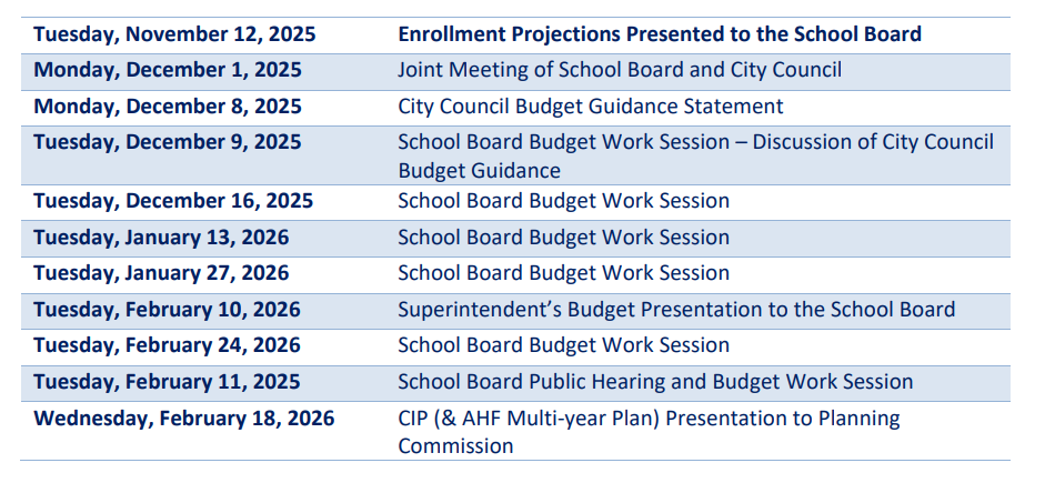 Budget Schedule – over the next few months, general government staff and the schools will develop their proposed budgets which will be in front of the City Council on March 26. Below are the meetings, work sessions, and town halls scheduled if you’d like to tune in.