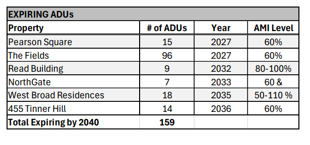 - The bad news is that we have 159 older affordable housing units (everything that came online pre 2016) that will expire in the next 10 years. Discussions have been underway about the policy, cost implications of those expirations, and the importance of the Virginia Village project.