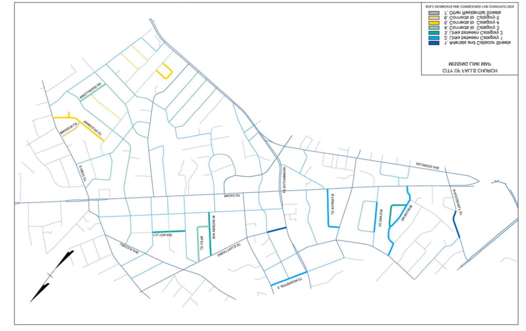 - Staff has proposed a new missing link map of sidewalk opportunities (below), with tiers based on constructability, previous requests, and right of way availability.