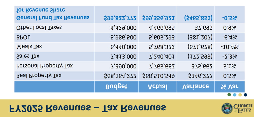 - Local tax revenues – we are keeping a close eye on the local economy and sales, meals, and business taxes are a good barometer of consumer sentiment (local taxes make up about 30% of our budget – again a good reminder to shop local!). While these categories of revenues are growing over last year, they did still come in below our original budget expectations. In particular, three areas: